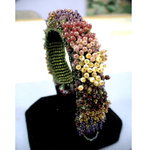 This cuff-style bracelet involves creating a square stitched base, off of which you create flower stalks (beaded fringe), a picot edging and a garden path (book binding stitch) along each side. A button clasp and loop finish off the piece. Special attention is paid to managing thread tension. A color blending strategy is applied.